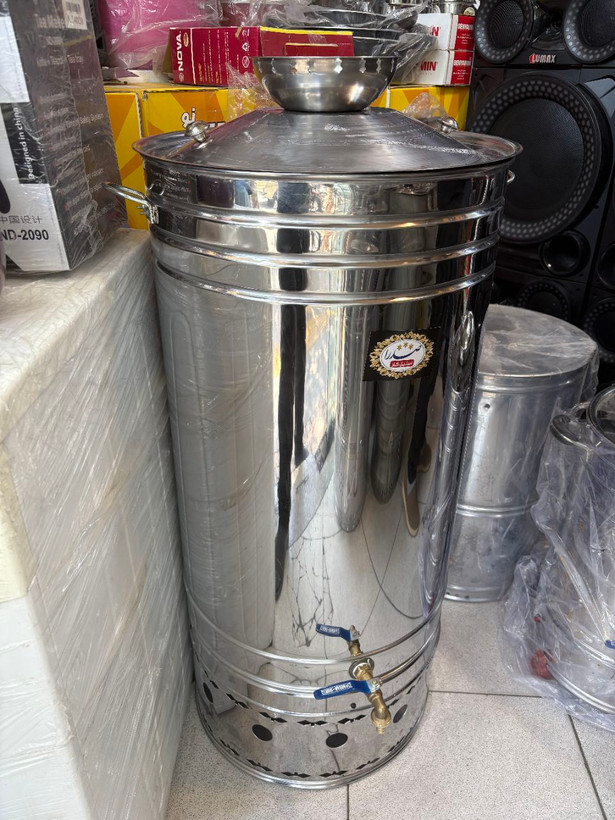سماور گازی ۱۲۰ لیتر طلایی هییتی گازی مجلسی ورق ضخیم تر صدرا استیل کار